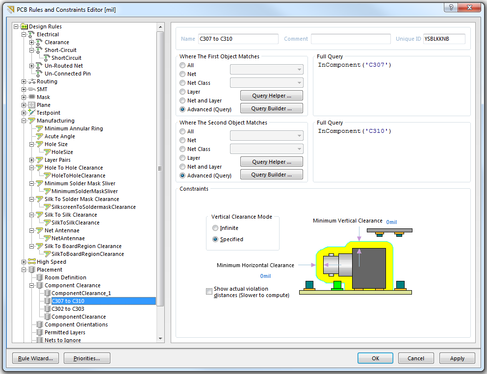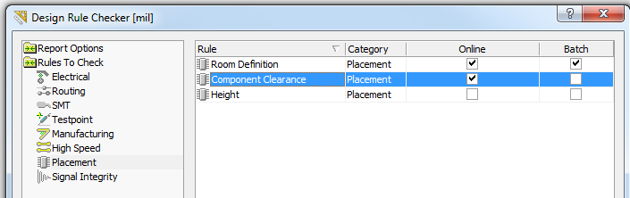 It sounds like your vertical component clearance is set to infinite, or at least a ridiculous number. I generally set mine to 0mm unless a specific application requires that I change it. You can modify this value in the Design -> Rules window (shortcut D-R), down near the bottom under «Placement». Look for «Component Clearance» and set the «Minimum Vertical Clearance» to 0mm. If the radio button to the left is set to «Infinite» you’ll have to change it to «Specified» before adjusting the number. See if that helps.