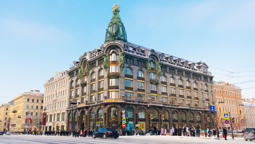 Дом компании «Зингер», также известный как «Дом книги», был построен в начале века Павлом Сюзором, здесь впервые в России был применен металлический каркас. Современники упрекали его за соседство с Казанским собором – будущий главный архитектор города Лев Ильин утверждал, что коммерческая фирма не должна перетягивать внимание с религиозного сооружения. Благодаря куполу со стеклянным глобусом здание получилось выше, чем было разрешено по регламенту, а значит и выше Зимнего дворца. Тем не менее, сейчас горожане любят его, особенно когда подсвечен купол.