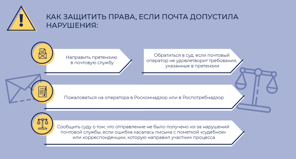 Об ошибке оператора прежде всего необходимо сообщить самой почтовой службе. Например, действия «Почты России» можно обжаловать на ее официальном сайте. Если оператор не выполнит требования в течение тридцати дней, можно обратиться в суд с иском об устранении нарушений и возмещении ущерба (ст. 37 Федерального закона «О почтовой связи»).