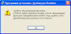 При установке драйверов Рутокен возникает ошибка: «Вызывающая функция: RTDRVS_Select_Rutoken_Driver. Вызываемая функция: SetupDrEnumDriverInfo. Код ошибки: 259: Дополнительные данные отсутствуют»