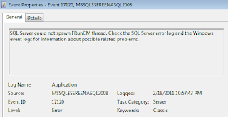 SQL Server could not spawn FRunCM thread. Check the SQL Server error log and the Windows event logs for information about possible related problems.