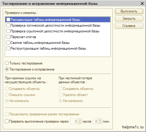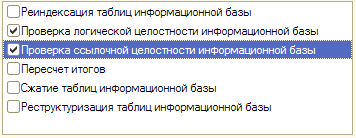 В первом случае программа проведет проверку информационной базы без внесения в нее каких-либо изменений. Во втором случае будут выполнены директивы, указанные во второй группе настроек. Смысл переключателей понятен из их названия.