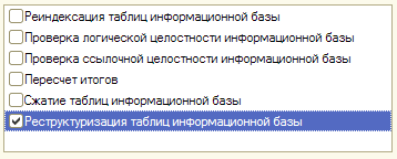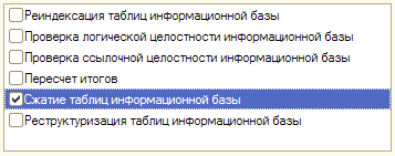 11. Со временем базы данных сильно увеличиваются в размерах. Это происходит, потому что в базе накапливается много данных, которые мы пометили на удаление, затем удалили, но на самом-то деле в базе они по-прежнему остались (просто мы их больше не видим). Пункт «Сжатие таблиц информационной базы» производит их настоящее удаление и база сокращается в размере: