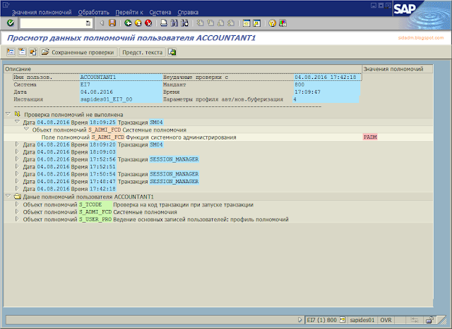 | Рис. 6. Анализ полномочий на работу в транзакции SM04. |